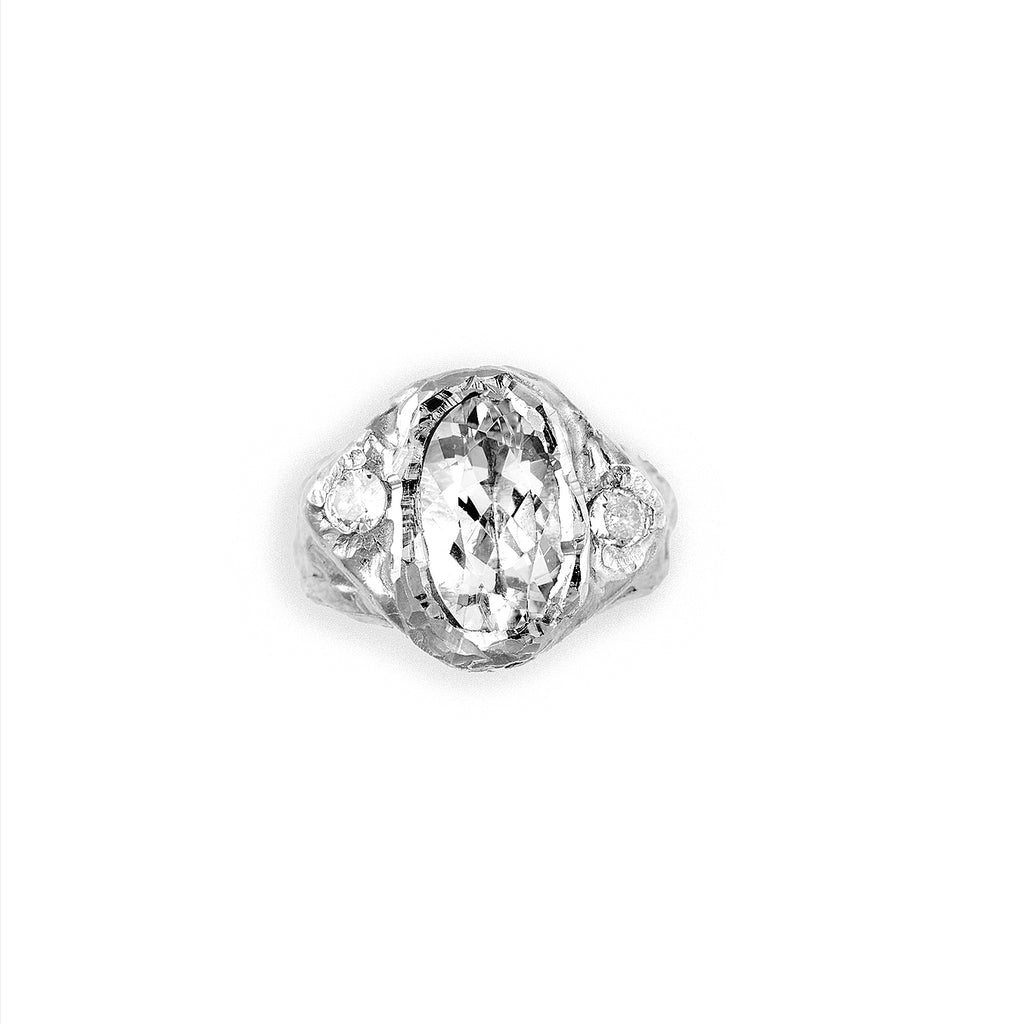 Pedras: Cristal natural oval e dois brilhantes sintéticos redondos.