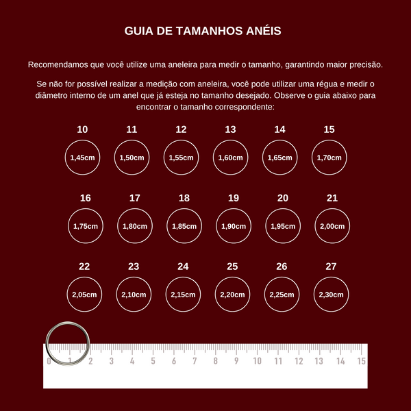 Prazo: Para joias em estoque, seu pedido será enviado em até 3 dias úteis. Para peças sob encomenda, como anéis, nosso ateliê dedicará até 15 dias úteis para criar uma joia exclusiva para você – um tempo precioso para garantir a excelência que você merece.
