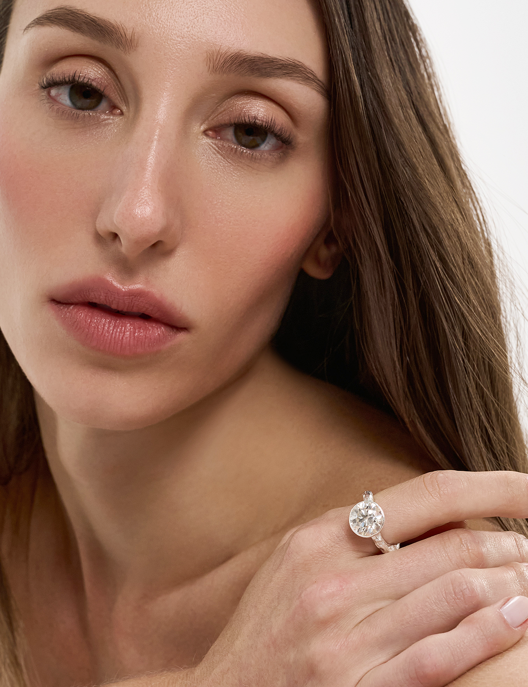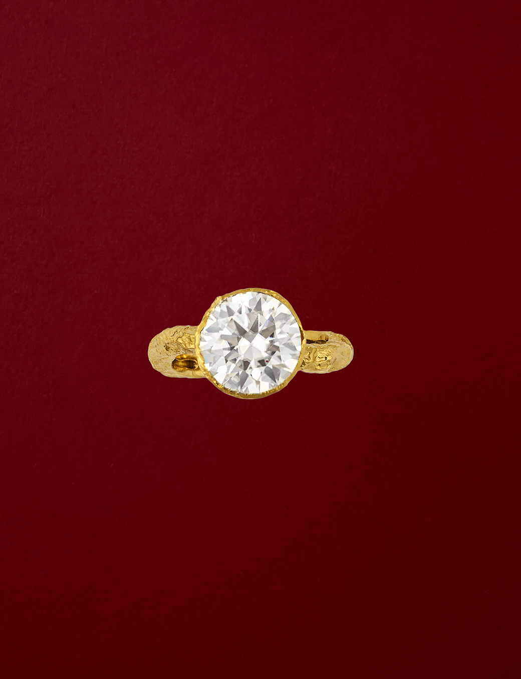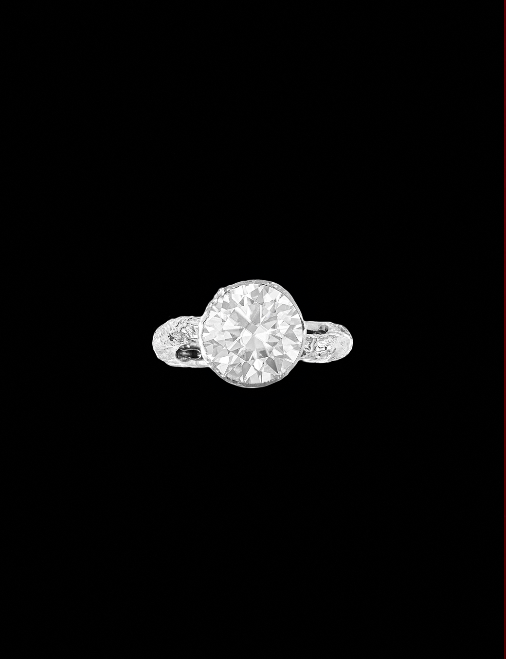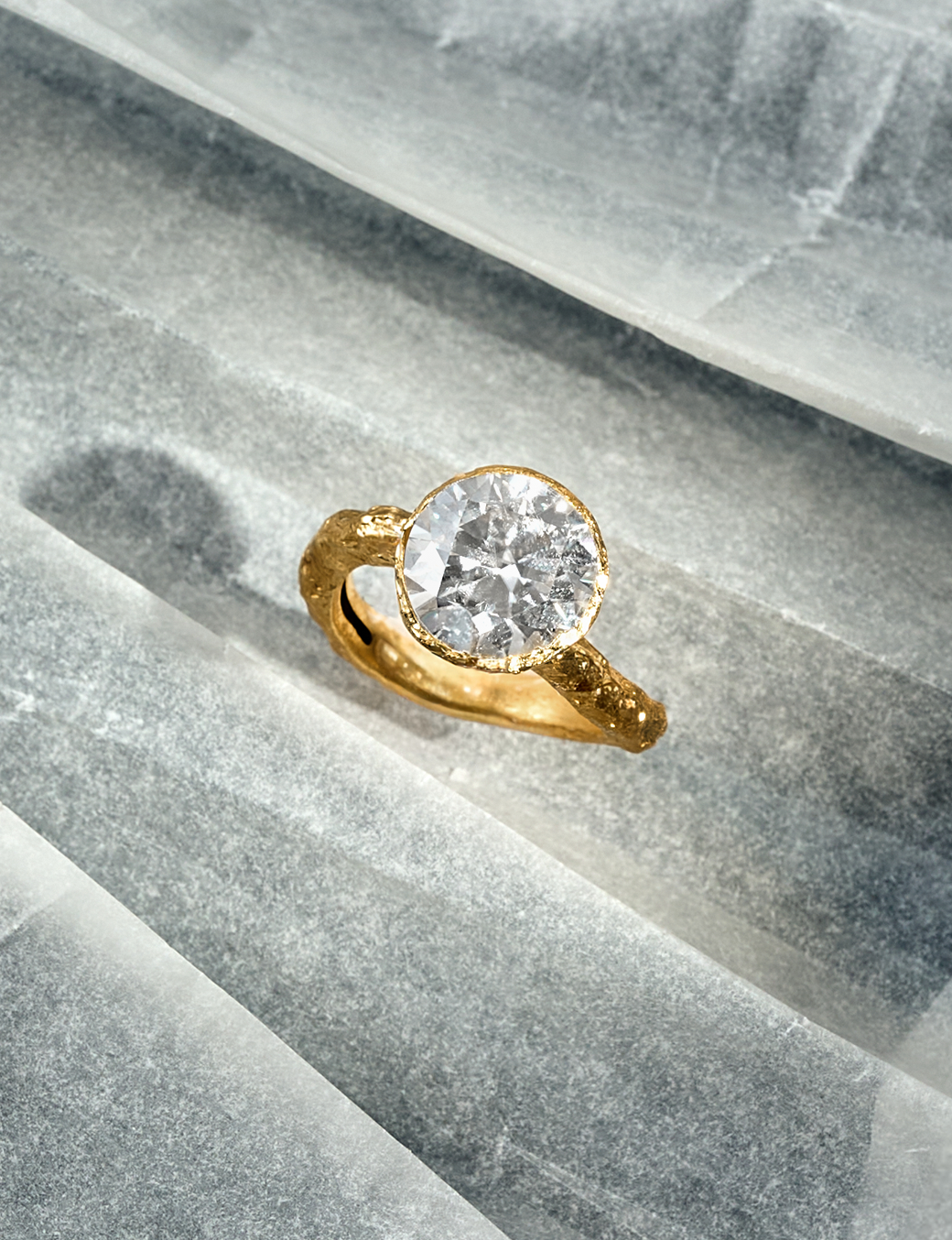 Como um fragmento de luz suspenso no tempo, o anel The Solitaire revela o encontro entre a matéria bruta e a precisão do gesto humano. O aro, de superfície irregular e orgânica, parece ter sido moldado pela erosão lenta dos elementos, carregando texturas que absorvem e refletem a luz de forma sutil e inesperada.