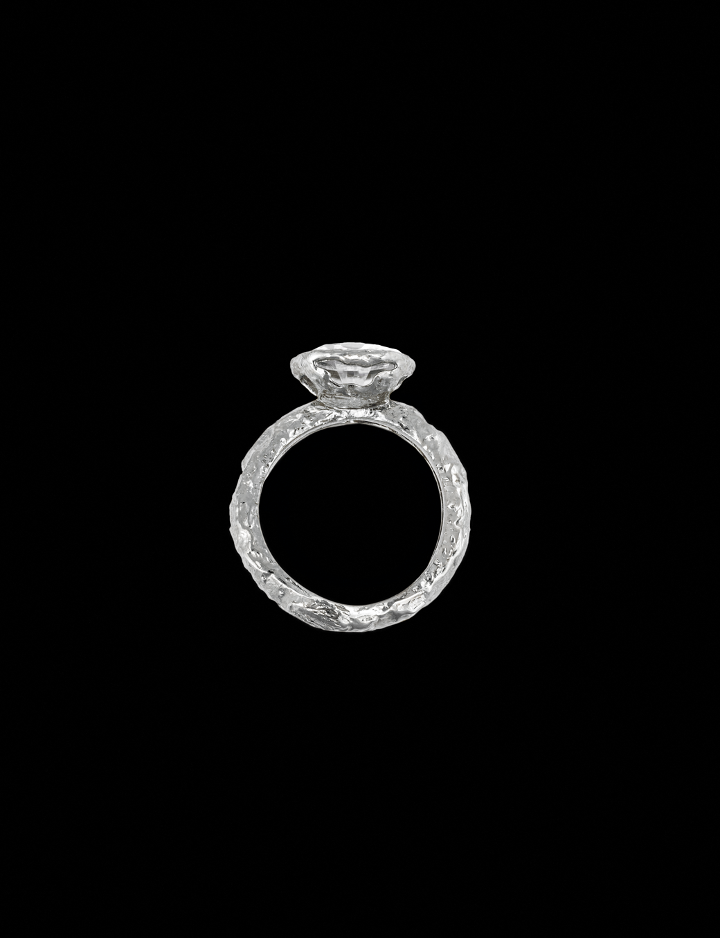No centro, a pedra lapidada surge como um ponto de clareza absoluta. Seu brilho límpido contrasta com a densidade do metal, criando um equilíbrio entre o instintivo e o refinado, entre o que é selvagem e o que é cuidadosamente construído.