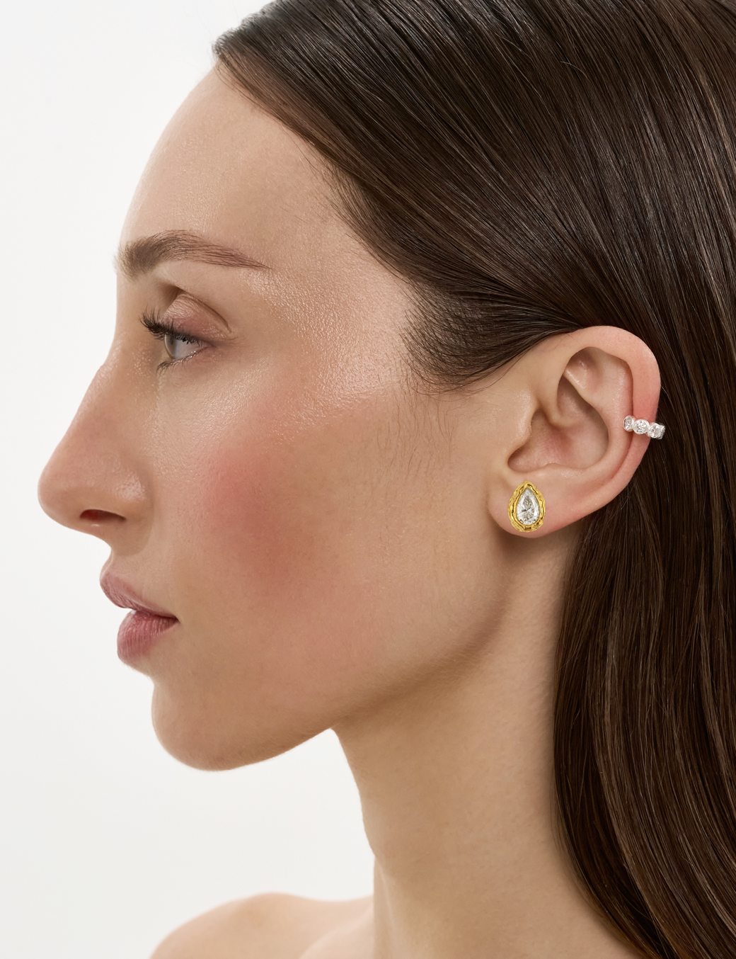 Como fragmentos de matéria moldados pelo tempo, estes brincos exploram a força do orgânico em contraste com a precisão da lapidação. Suas superfícies irregulares capturam a luz de forma imprevisível, criando um brilho que ilumina qualquer produção.