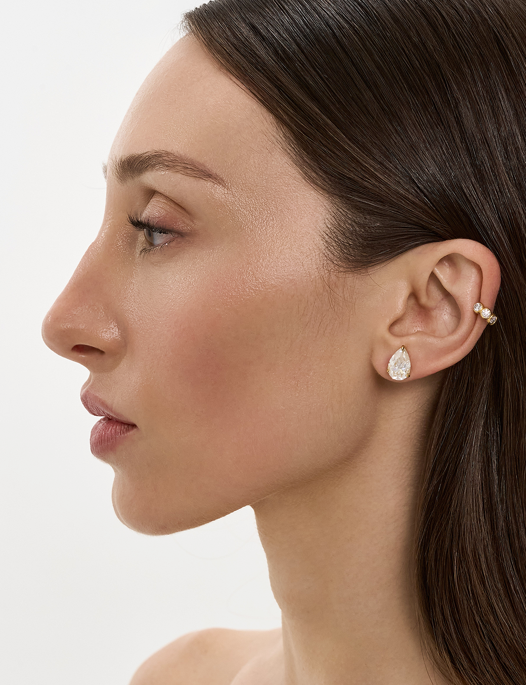 Como um ponto de luz suspenso, estes brincos exploram o encontro entre delicadeza e tensão. A pedra se projeta com clareza, enquanto o metal, em sua forma orgânica, a envolve de maneira quase imperceptível, como um gesto que segura sem conter.